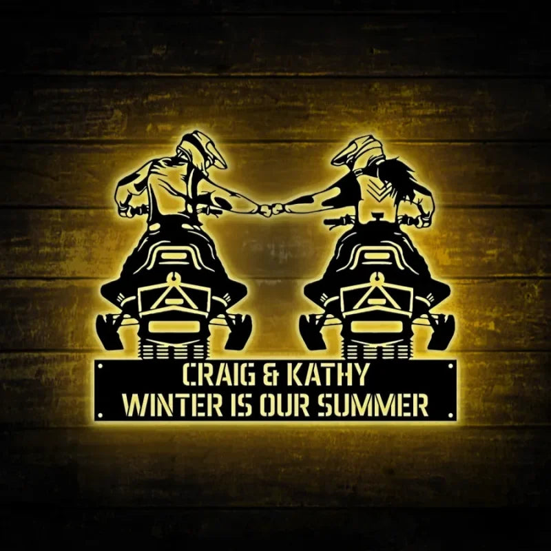Custom Couple Snowmobile Metal Wall Art With Led Lights, Snowmobile Metal Wall Decor, Personalized Couple Name Metal Sign, Winter Games Metal Sign