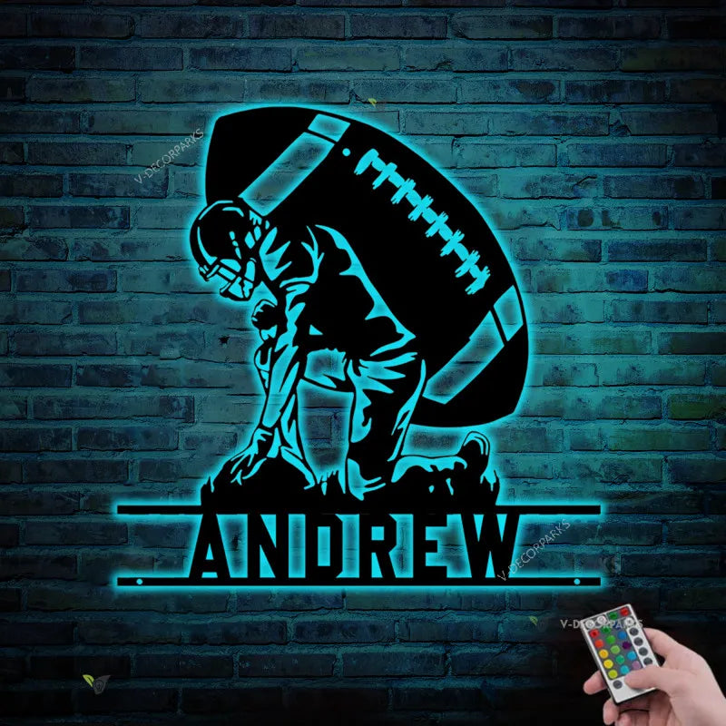 Custom Football Player Metal Wall Art With Led Light, Personalized Football Player Name Sign Decoration For Room, Football Metal Led Decor