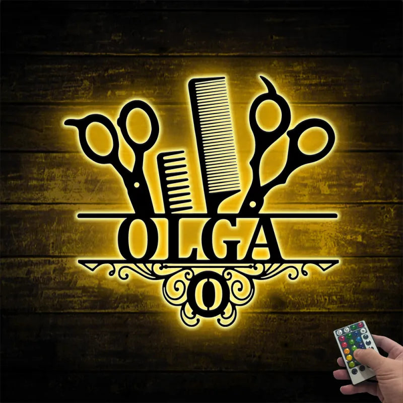 Custom Hair Salon Metal Wall Art With Led Light, Personalized Hair Stylist Name Metal Sign, Custom Barber Shop Metal Led Wall Decor