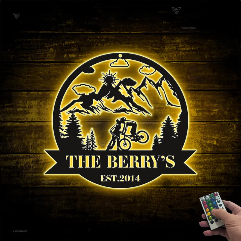 Custom Mountain Biking Metal Wall Art Led Lights, Personalized Couple Biker Family Name Metal Sign, Biker Metal Name Sign, Cycling Metal Wall Art