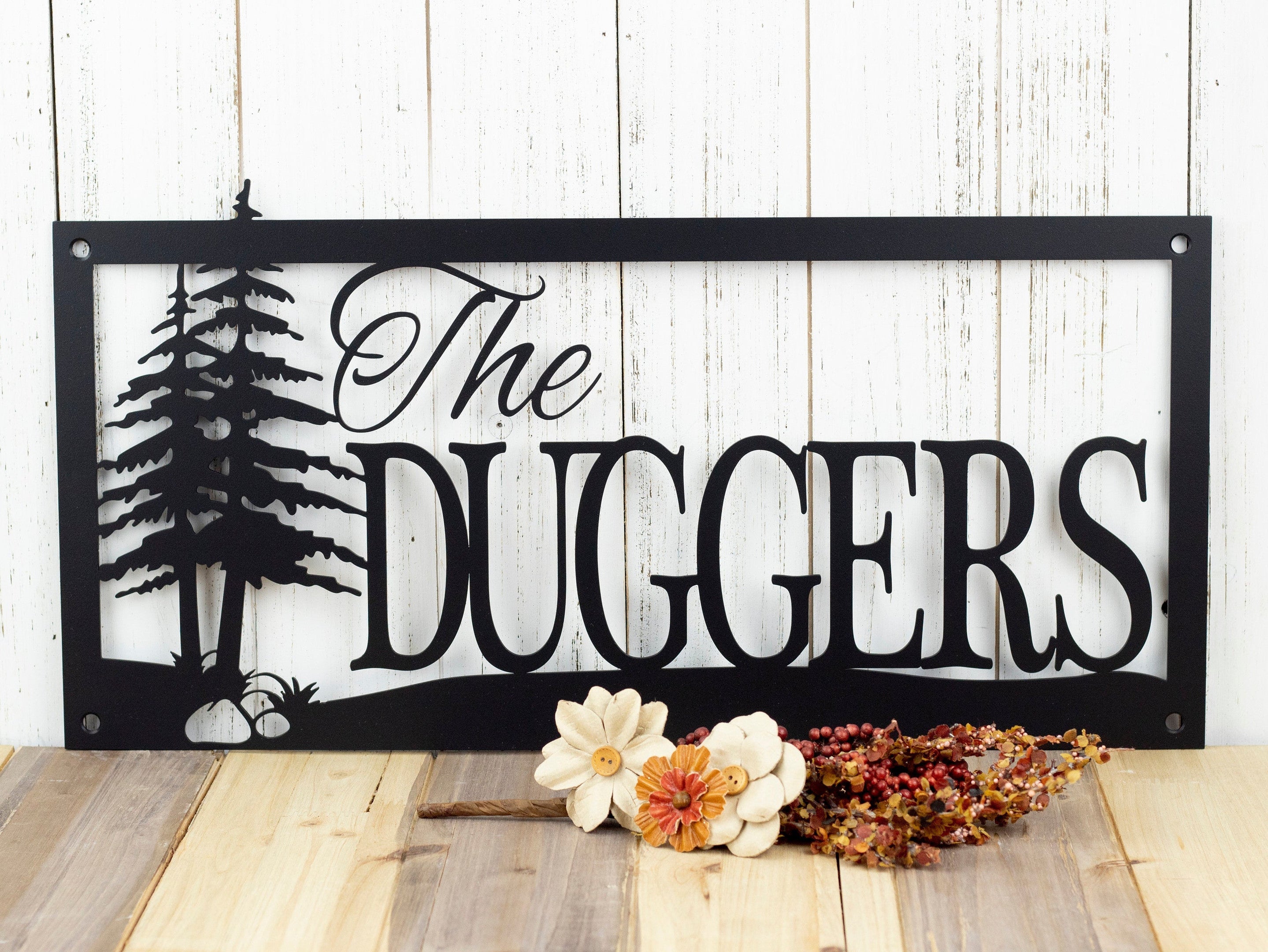 Custom Outdoor Family Last Name Metal Sign With Pine Trees And Rocks Black Custom Sign House Sign Decorations