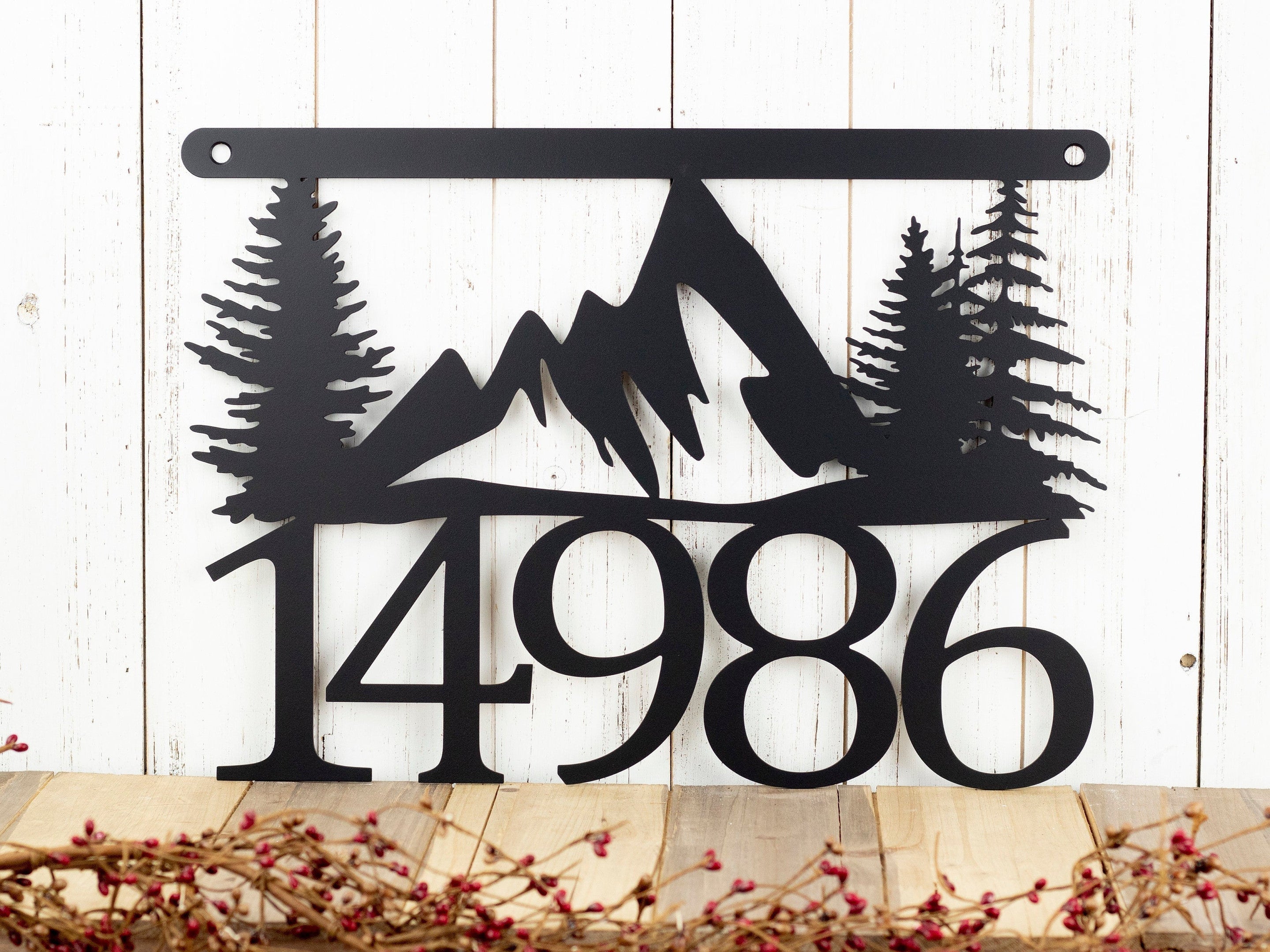 House Number Plaque With Mountains And Pine Trees Metal Sign Cabin Signs Lake House Decor Rustic Matte Black Shown Decorations